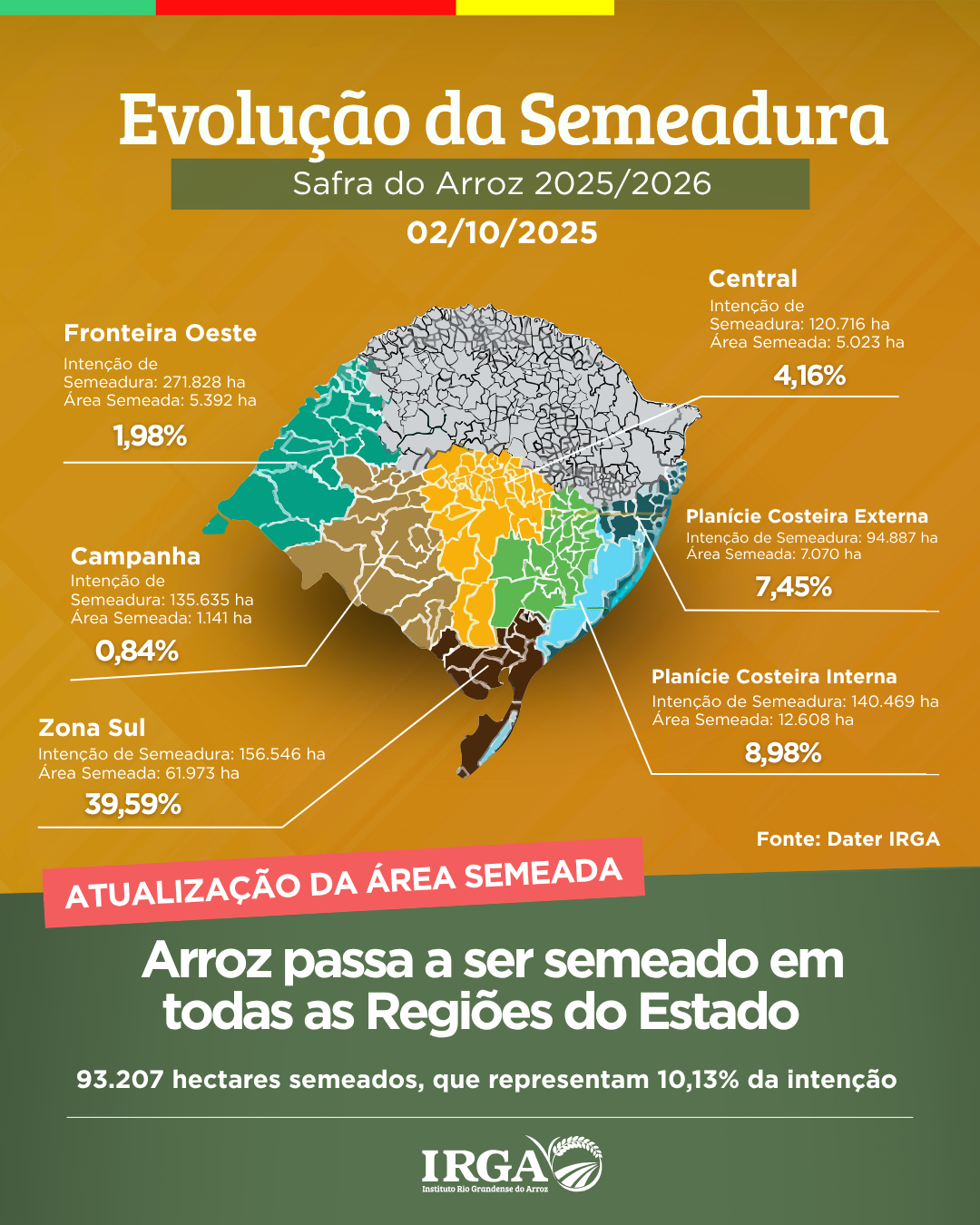 O Instituto Rio Grandense do Arroz (Irga) vem acompanhando os índices de semeadura de arroz no Estado do Rio Grande do Sul, ao todo, já foram semeados 93.207 hectares, ou seja, 10,13% da intenção.