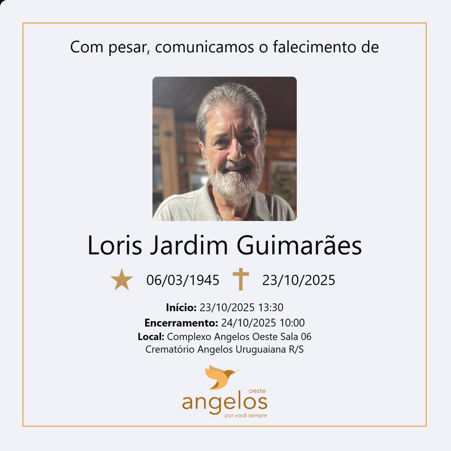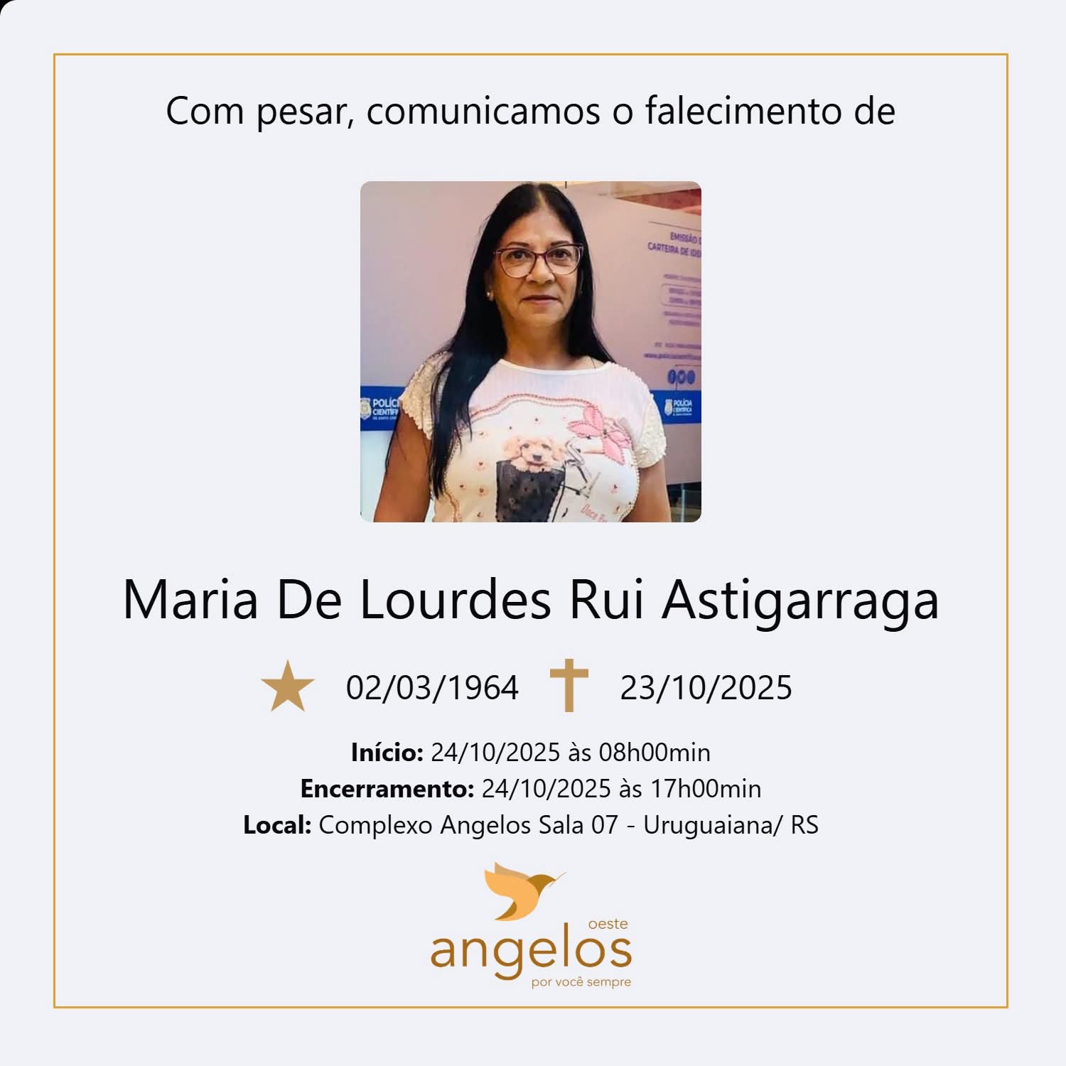 Sepultamento: 24/10 | 9h30min | Cemitério Municipal de Uruguaiana
