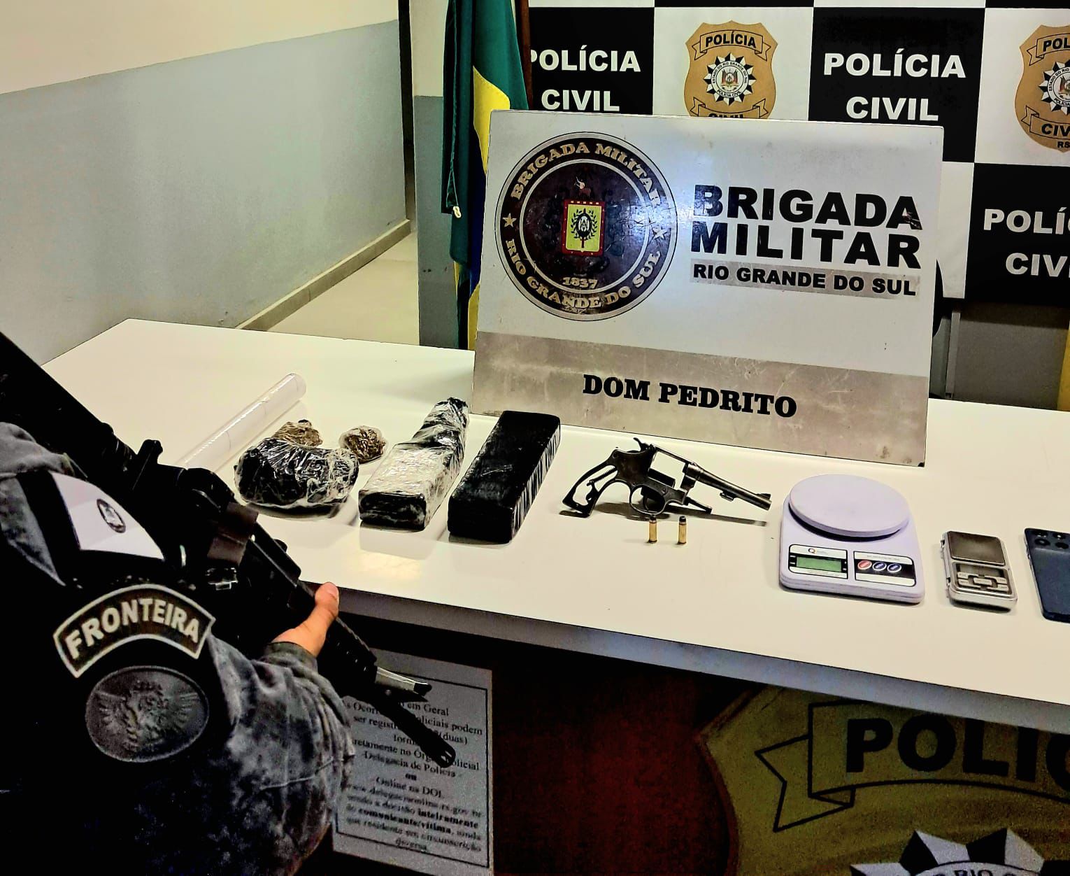 Durante a ação, foram apreendidos 1,054 kg de maconha, duas munições calibre 32 mm, um revólver calibre .32, duas balanças de precisão, um aparelho celular e um rolo de plástico filme.