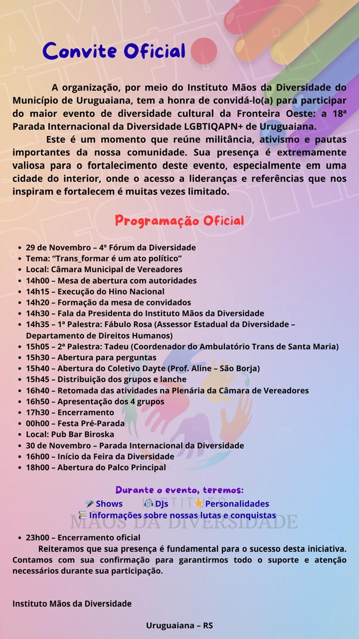 A 18ª Parada Internacional da Diversidade LGBTQIAPN+ de Uruguaiana conta com o apoio da Prefeitura Municipal, das Secretarias de Cultura e Saúde, além de diversas empresas locais que fortalecem a causa.