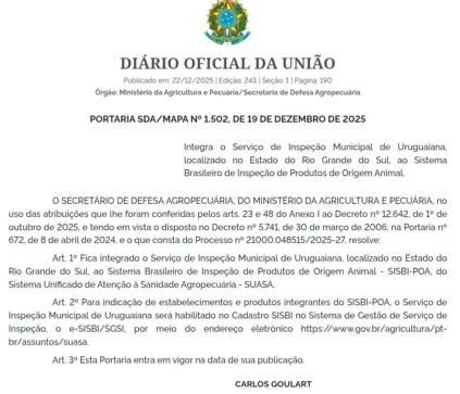 Com a decisão, Uruguaiana passa a integrar oficialmente o Serviço Brasileiro de Inspeção de Produtos de Origem Animal (SISBI), o que representa um marco para pequenos, médios e grandes produtores do município.