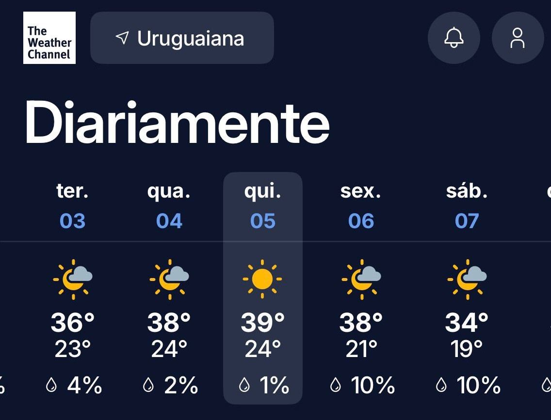 Nesta segunda-feira (2), a máxima projetada para Santa Maria é de 30°C. Já na sexta (6), os termômetros devem chegar aos 35ºC no município da Região Central, conforme previsão da Climatempo.
