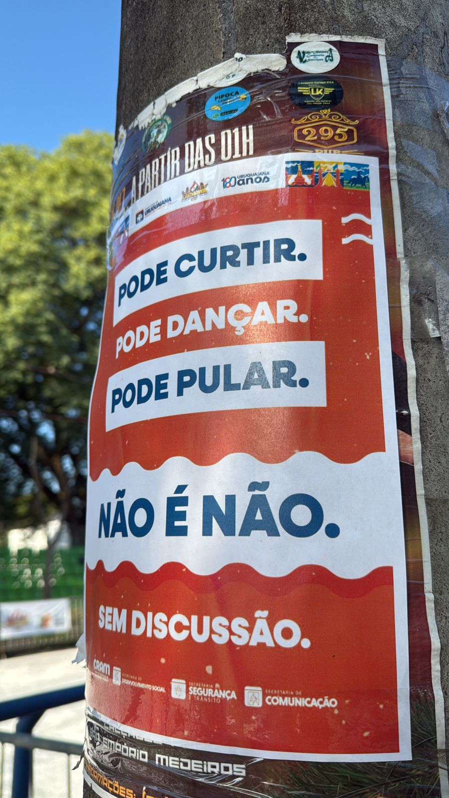 “Espalhamos cartazes coloridos em diversos pontos da avenida, também em banheiros químicos, com o alerta para as mulheres sobre o ‘não é não’”, destacou Juliana.