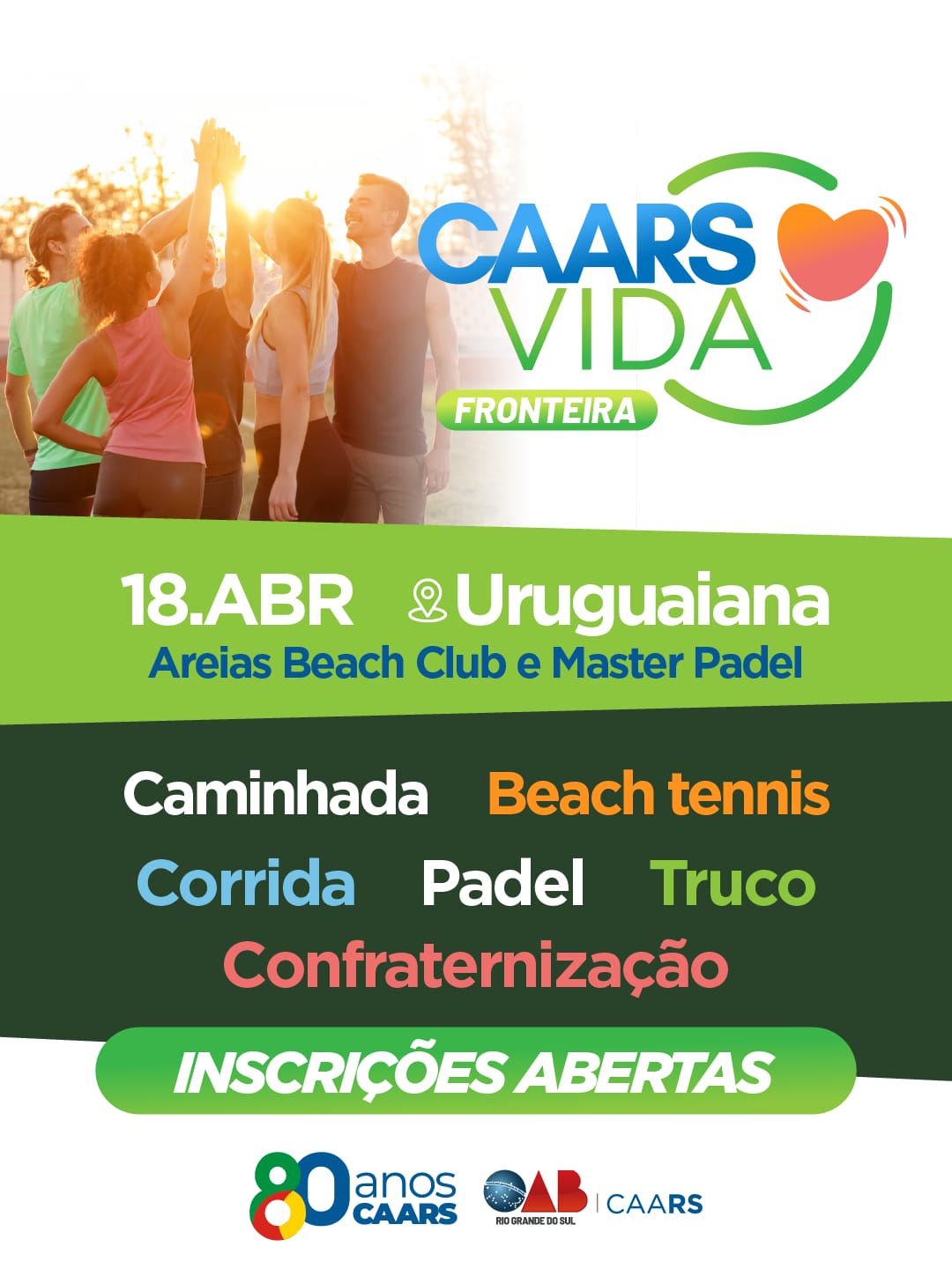 Está chegando na Fronteira o maior evento itinerante do Sistema OAB/RS: o CAARS Vida. Será no dia 18 de abril, em Uruguaiana. Podem participar advogados e estagiários de Direito com a anuidade da OAB/RS em dia e seus dependentes cadastrados na Caixa de Assistência dos Advogados do Rio Grande do Sul (CAARS).