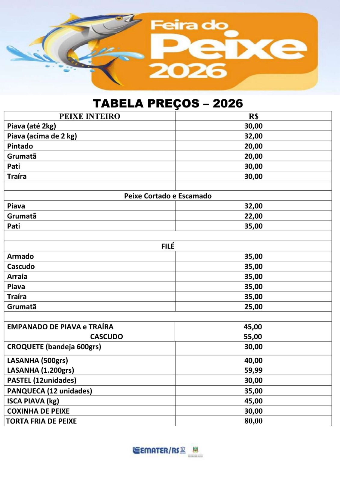 Confira abaixo a tabela de preços dos peixes disponíveis.