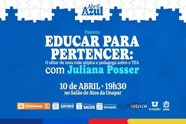 No dia 10/04, às 19h, no Salão de Atos da Unopar, Uruguaiana recebe a palestra “EDUCAR PARA PERTENCER: o olhar de uma mãe atípica e pedagoga sobre o TEA”, voltada às famílias atípicas.