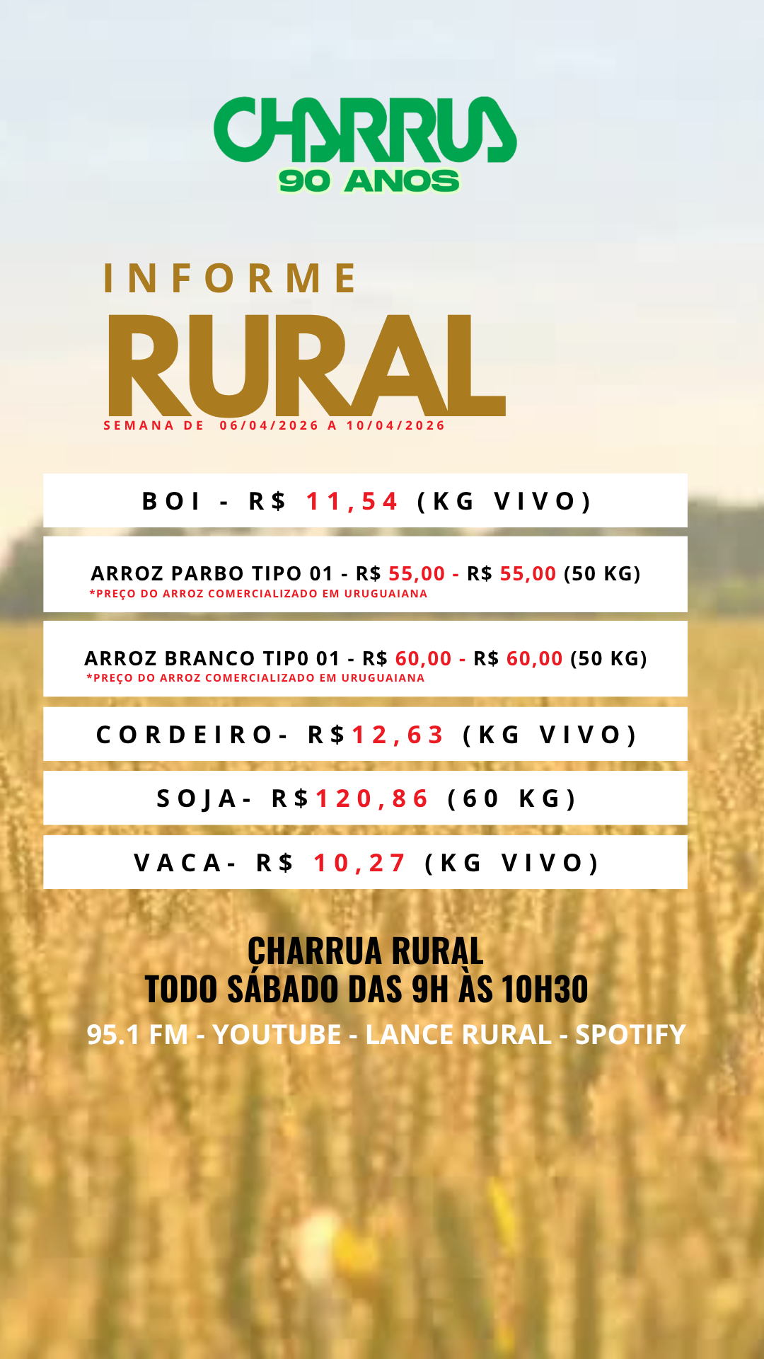 Confira as cotações do agronegócio da semana (06/04/2026 a 10/04/2026) pela Rádio Charrua.