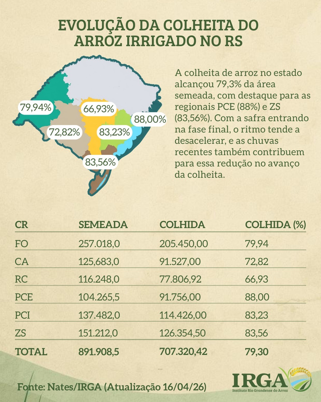 Segundo a Diretora Técnica do Irga, Flávia Tomita, "a colheita avança de forma consistente no Estado, com destaque para as regionais PCE e ZS, e, neste momento final da safra, é natural uma redução no ritmo, também influenciada pelas chuvas registradas ao longo da semana."