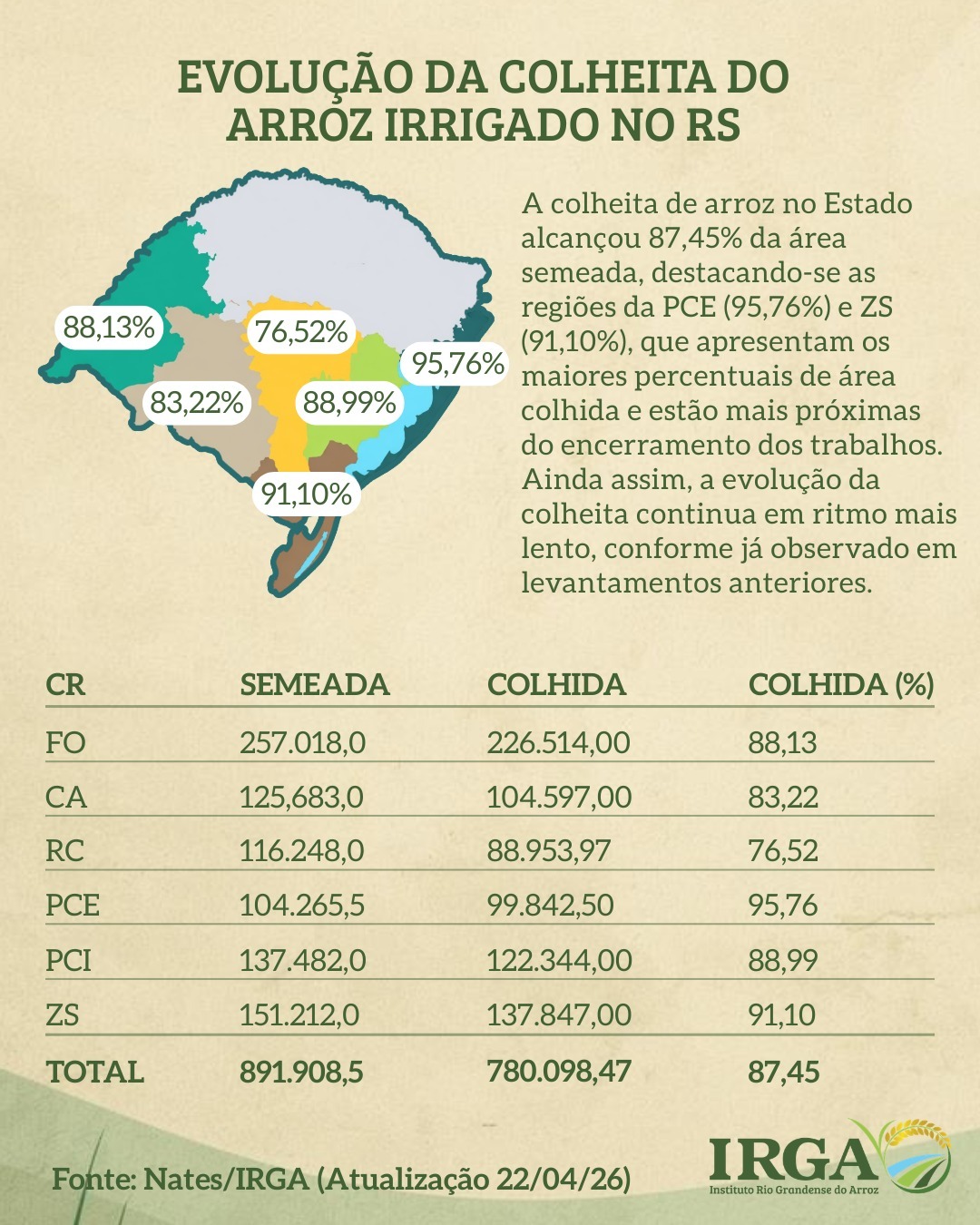 A colheita de arroz atingiu 87,45% da área semeada no Rio Grande do Sul. Os dados são do levantamento realizado pelo Instituto Rio Grandense do Arroz (Irga) e divulgados nesta quinta-feira (23). Esse percentual representa 780.098 hectares (ha) colhidos, de um total de 891.908 hectares destinados à cultura da safra de arroz 2025/2026.