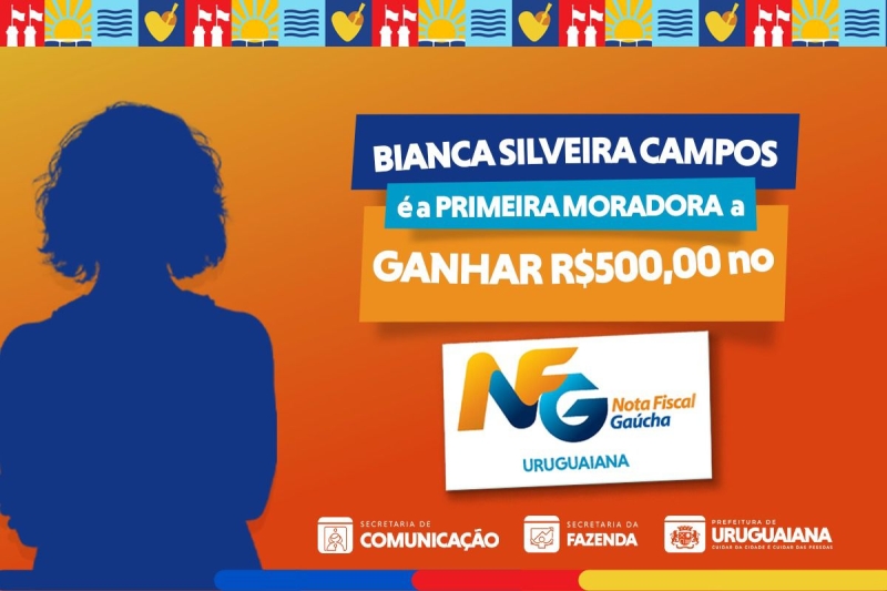 A Prefeitura de Uruguaiana, em parceria com o Nota Fiscal Gaúcha, anunciou o resultado do primeiro sorteio a nível municipal do Programa: BIANCA SILVEIRA CAMPOS foi a primeira a ganhar R$ 500 na cidade. Ela foi a vencedora com o bilhete de número 219.648. Essa é uma ação liderada pela Secretaria Municipal de Fazenda.