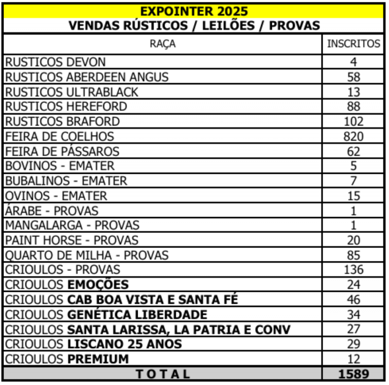 Conforme o comissário-geral da Expointer, Pablo Charão, houve um incremento significativo de inscrições de equinos da raça Crioula, de 143%. “Tivemos um crescimento de 70% nas inscrições de coelhos, por causa da feira de filhotes. E também se destaca o avanço nas inscrições de rústicos das raças de bovinos de corte Hereford e Braford, que foi 65% superior a 2024”, complementa.
