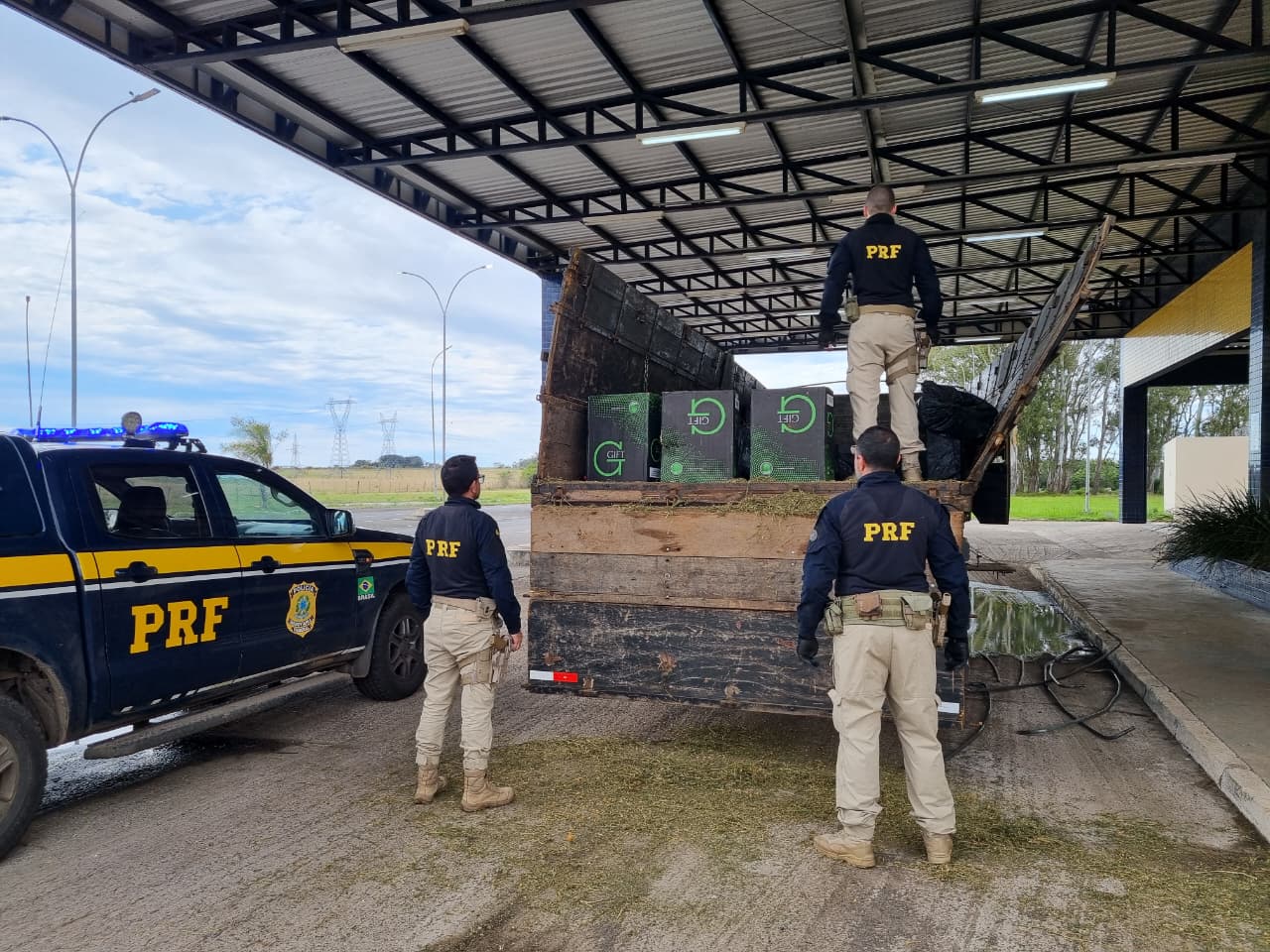 Durante fiscalização, os Policiais Rodoviários Federais deram ordem de parada ao condutor de um caminhão M. BENZ 1118 emplacado em Quaraí/RS. Ao vistoriarem o compartimento de carga, os agentes encontraram o produto contrabandeado escondido sob uma carga de alfafa.