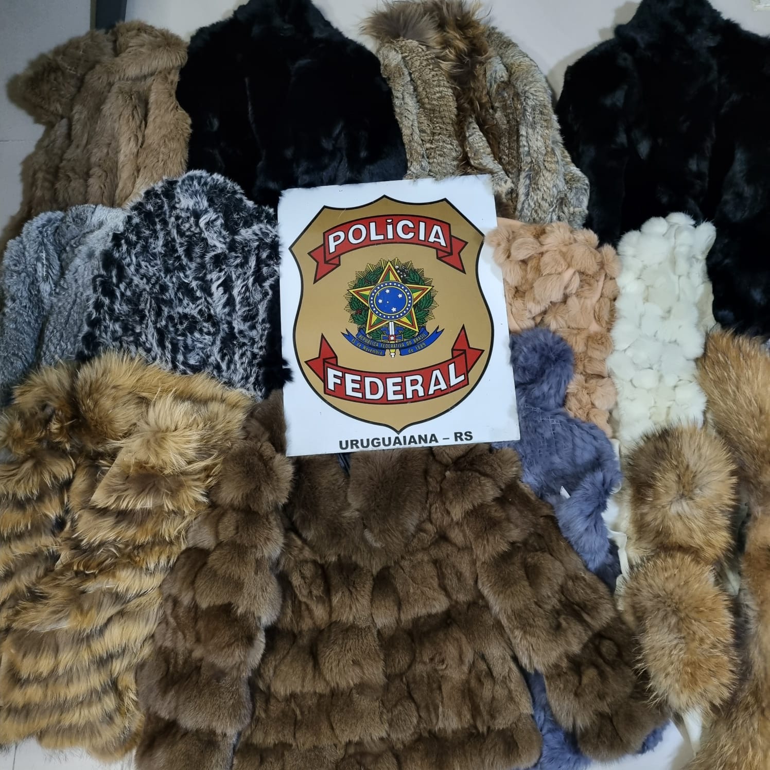 Durante as buscas, policiais federais apreenderam casacos, supostamente confeccionados com peles de raposa e coelho, além de um aparelho celular.